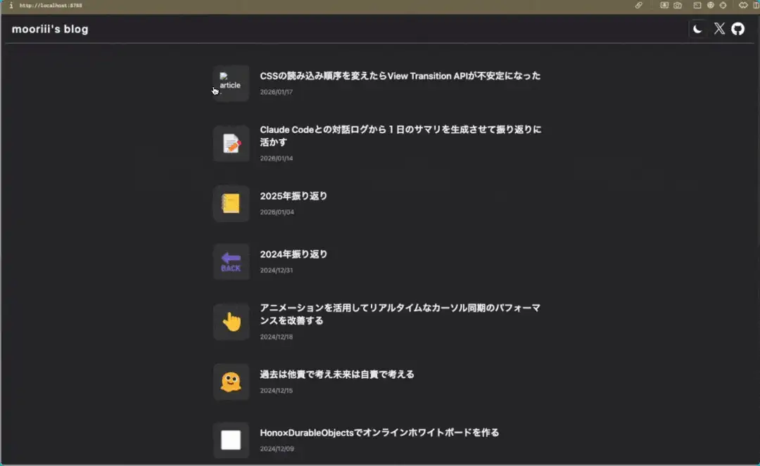 MPAでも遷移にアニメーションを付けられるということで、HonoXのSSGで作られた弊ブログにも導入してみます。